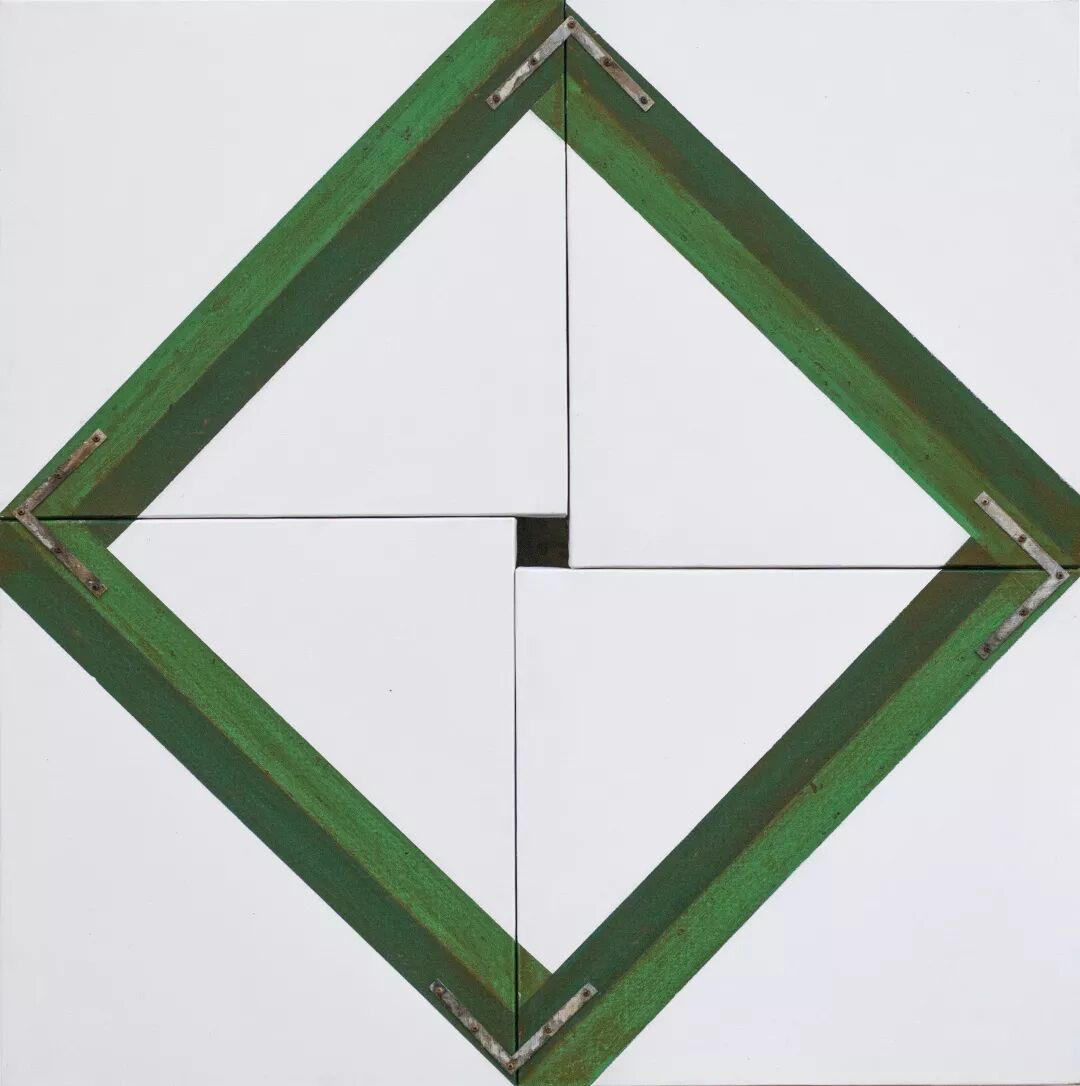 ▲ 臧坤坤,调和XV,木,亚麻布,丙烯,铅笔,水,铝,U型钉,150 x 200 x 5.5 cm,2018