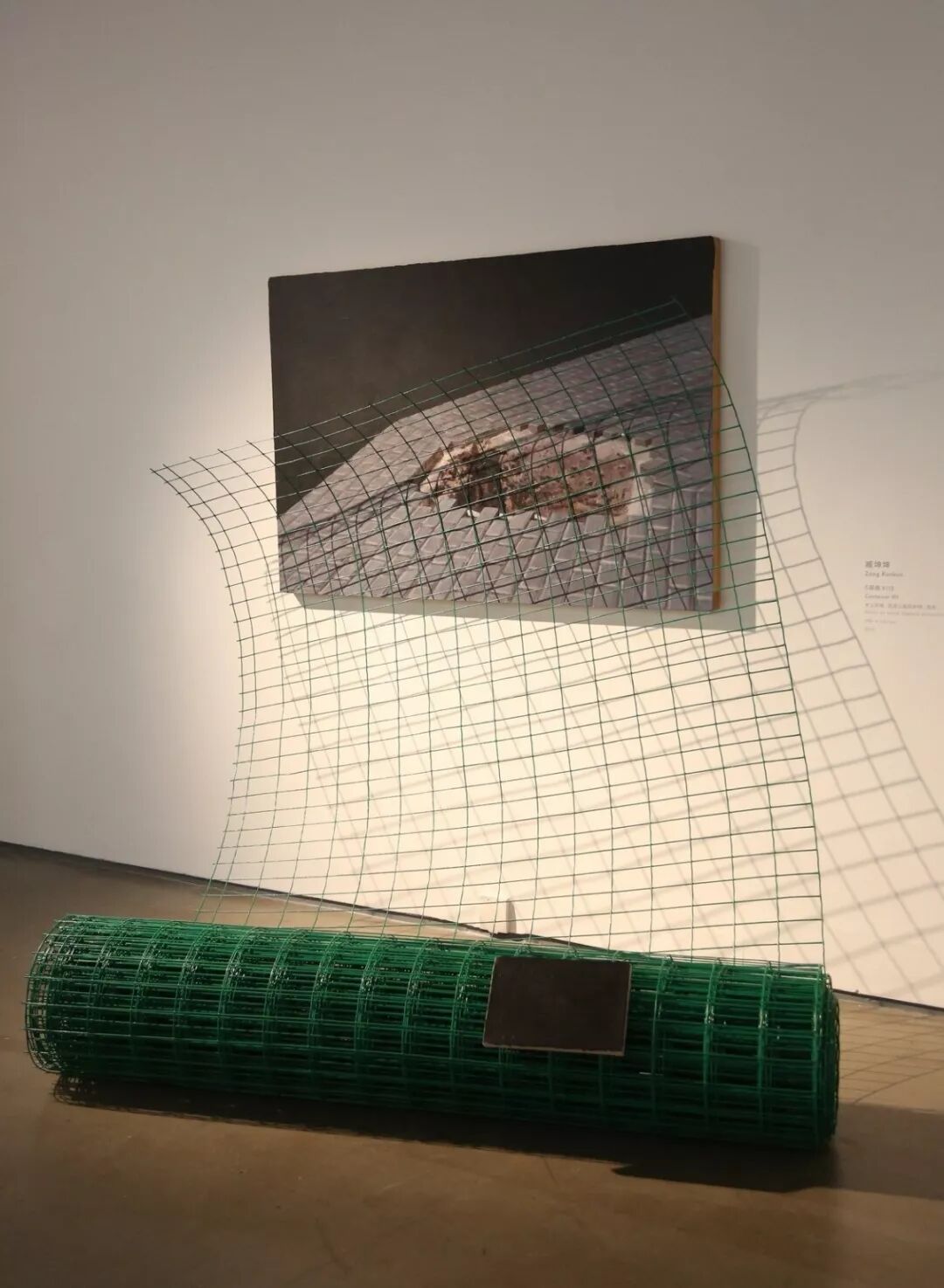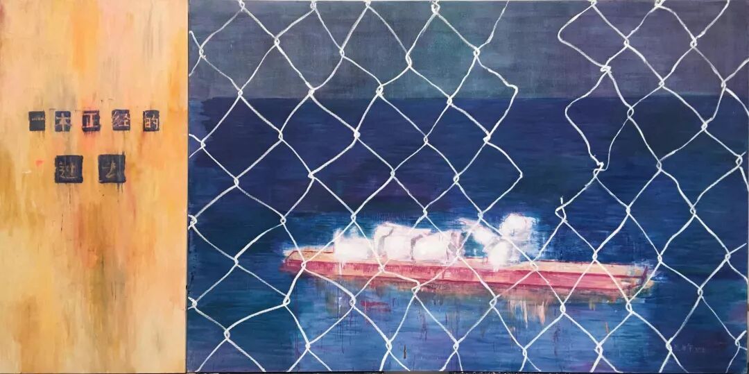▲ 臧坤坤,容器XII,木上丙烯、高速公路防护网、画布,100 x 150 cm,2015