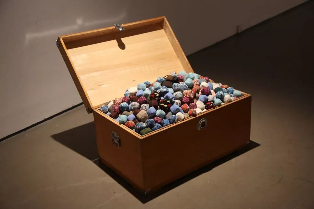 ▲ 司建伟,缝补记忆,旧衣布、锯末、玉米粒、旧衣柜、小音箱设备等,尺寸可变,2014