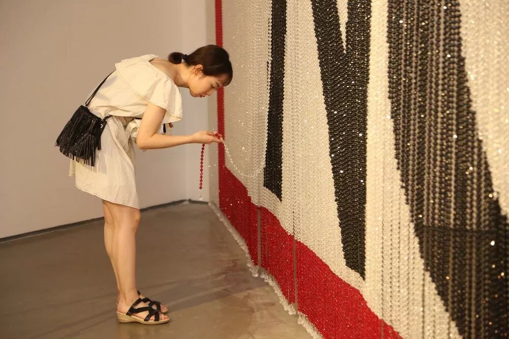 蔡雅玲的作品《No》主体是由黑、白、红三色串成的珠帘。观众从中穿过时将平静的珠帘打破,从这一由静至动的过程中获多重感官上的触动。