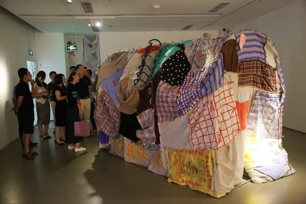 艺术家司建伟为到展观众介绍他与母亲共同完成的作品《缝补记忆》。