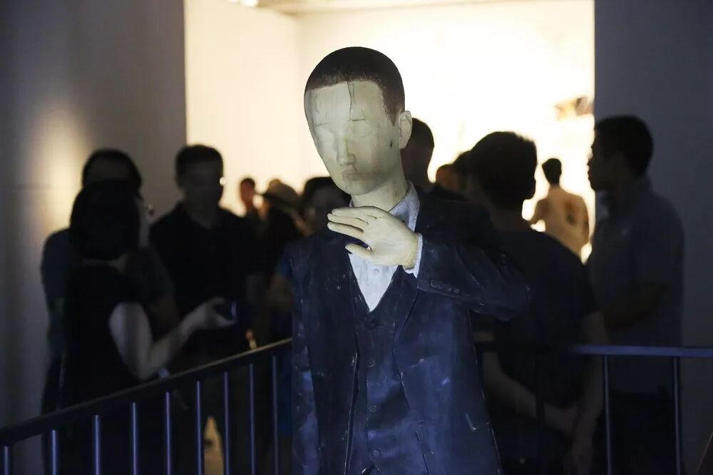 嘉宾及观众聚集在艺术家王卓的作品《抚梦》周围,王卓运用超现实主义的语言形式,将一种神秘气氛引入作品之中。