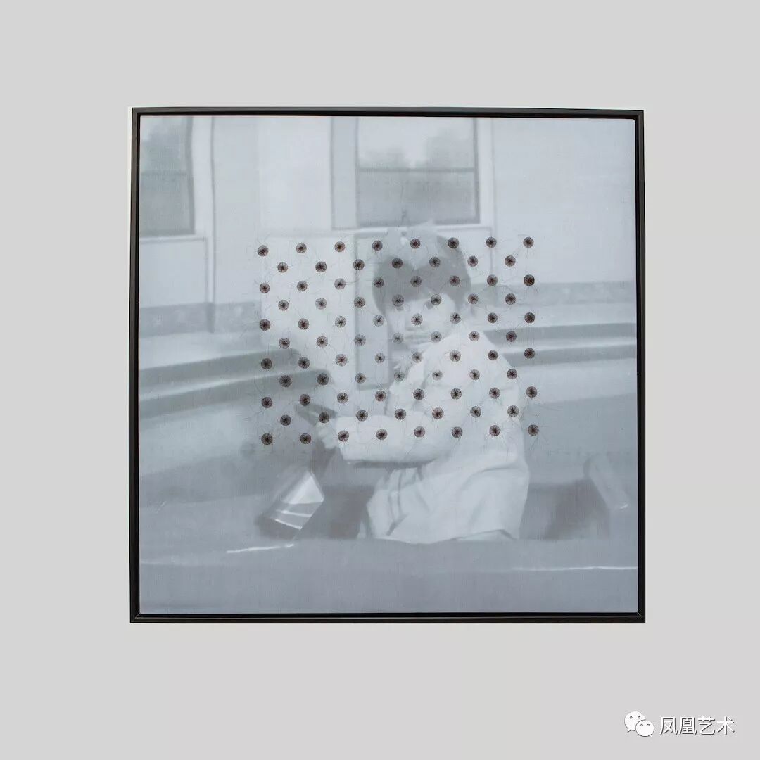 ▲ 蔡雅玲,1987年的我和母亲,我的黑头发、母亲的白头发、的确良布,100 x 100 x 10 cm,2018